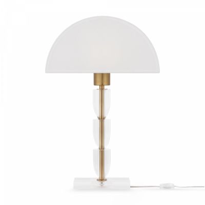 Арматура – металл. Оттенки – хром, латунь. Хлопковый абажур в белом цвете. Прозрачный акриловый декор в основании. Эстетика Баухауса, трендовая форма абажура. Цоколь Е14